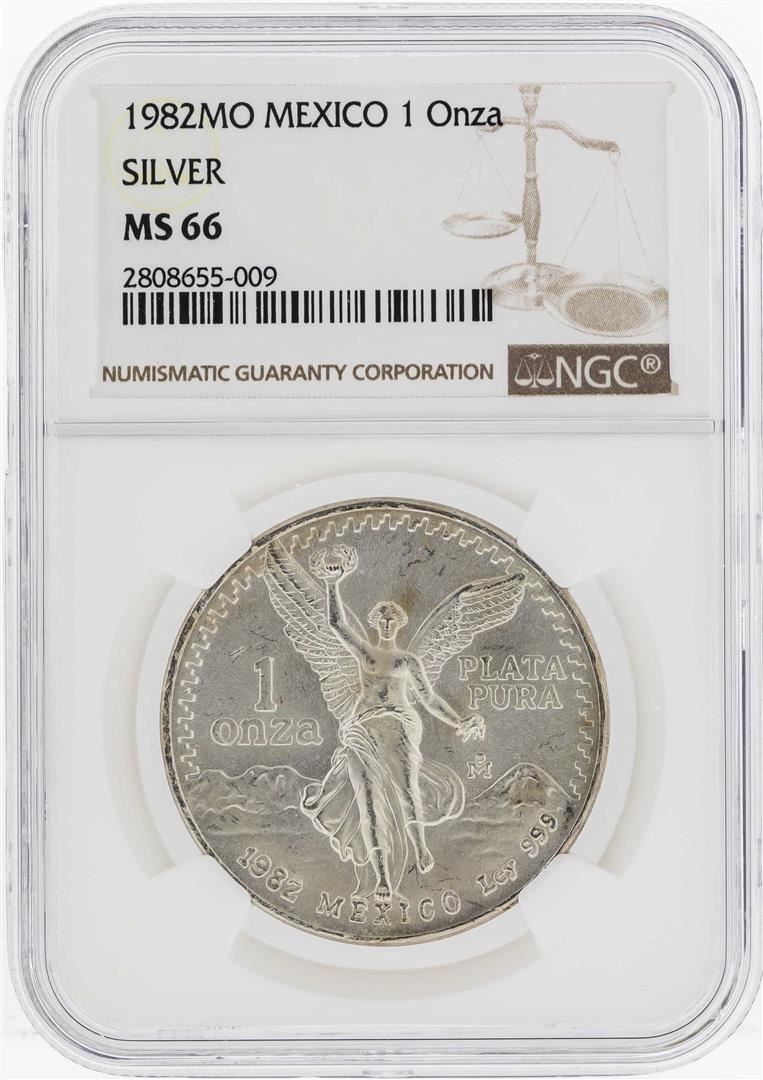 One 1982MO Mexico 1 Onza Silver Libertad Coin NGC MS66. NGC Certified.