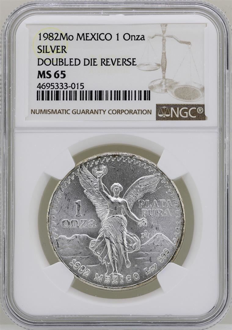 One 1982Mo Mexico Libertad Onza Doubled Die Reverse Silver Coin NGC MS65. NGC Certified.