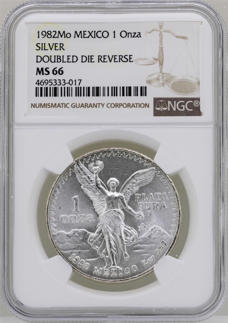 One 1982Mo Mexico Libertad Onza Doubled Die Reverse Silver Coin NGC MS66. NGC Certified.