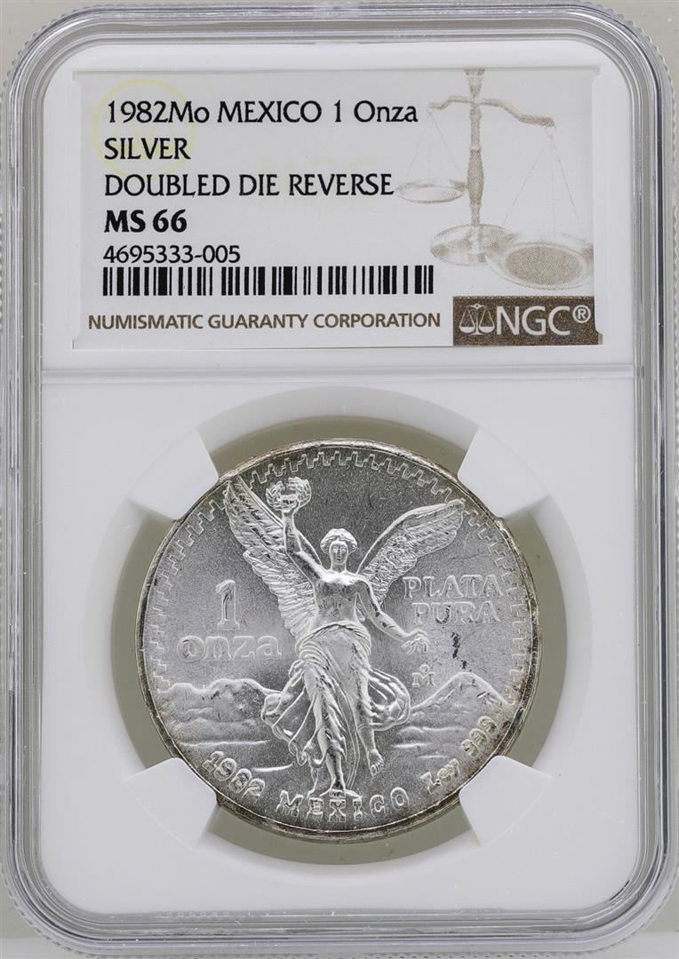One 1982Mo Mexico Libertad Onza Doubled Die Reverse Silver Coin NGC MS66. NGC Certified.