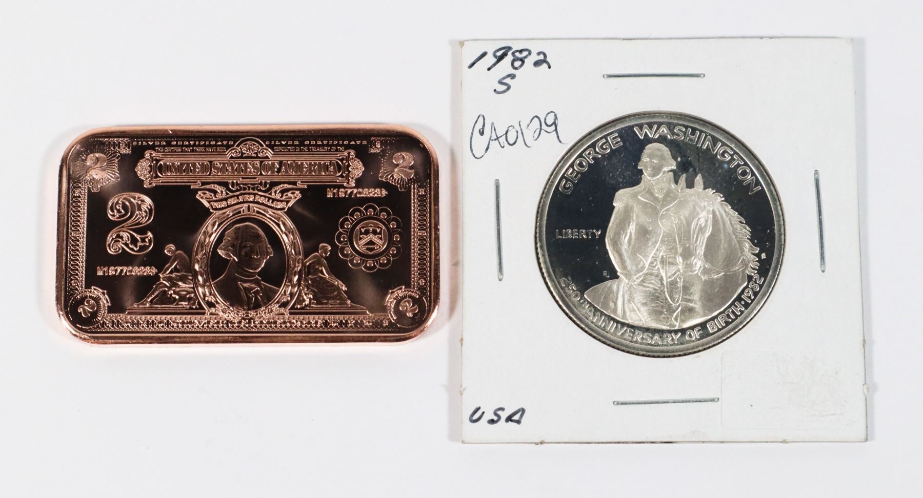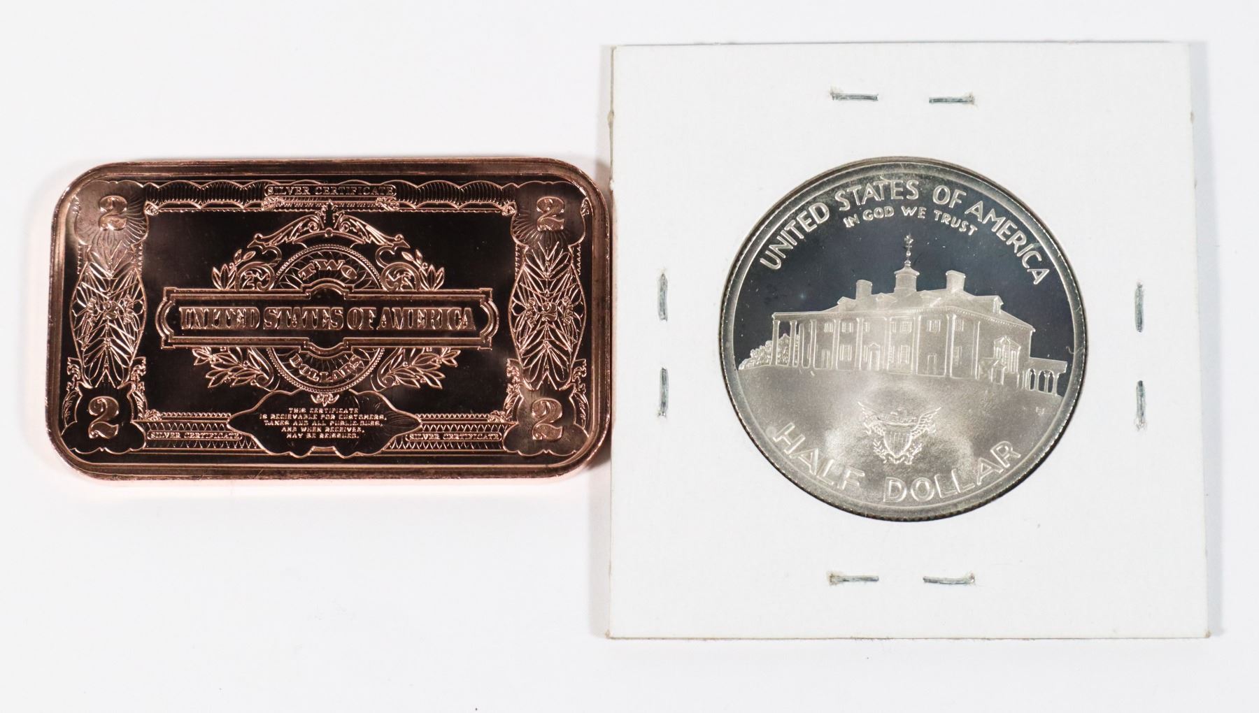 HALF DOLLAR SILVER PROOF (ASW 0.36-OZ) COMES WITH $2 GEORGE WASHINGTON BAR 1-OZ .999 FINE COPPER