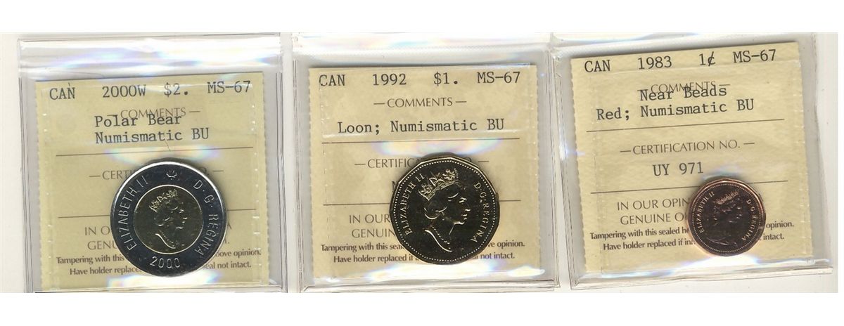 1983 1¢, 1992 Loon & 2000W $2. Lot of 3 ICCS MS67 NBU examples.