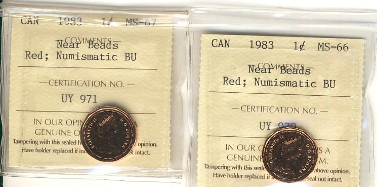 1983 1¢ Near Beads ICCS MS66 & MS67RD. Lot of 2 NBU designated examples.