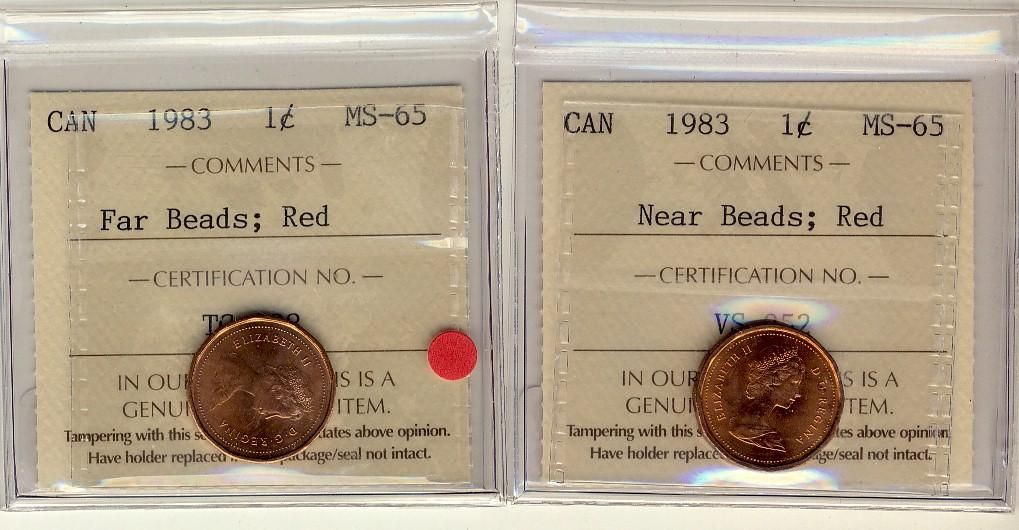 1983 1¢ Near and Far Beads ICCS MS65 Red, Lot of 2 coins.
