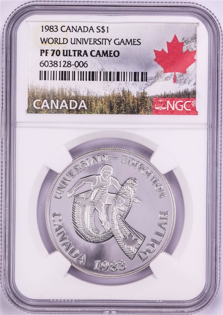 One 1983 $1 Proof Canada World University Games Silver Dollar Coin NGC PF70 Ultra Cameo. NGC Certified.