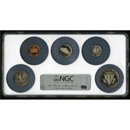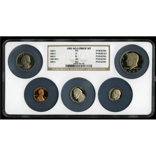 <B>1983<10C> No S Dime Proof Set,</B></I> certified and housed in a custom NGC holder as follows: <B>Cent PR68 Red Ultra Cameo NGC; Nickel PR69 Ultra Cameo NGC; No S Dime PR69 Ultra Cameo NGC; Quarter PR68 Ultra Cameo NGC;</B></I> and <B>Half Dollar PR69 Ultra Cameo NGC.</B></I> This valuable modern variety was created when a mintmark was omitted from the obverse die prior to shipment to San Francisco. An unknown, but extremely small quantity was released in proof sets.