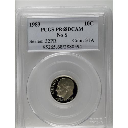 <B>1983<10C> No S PR68 Deep Cameo PCGS.</B></I> Essentially perfect surfaces with incredible contrast between the deeply mirrored fields and frosted devices. A noticeably "black and white" Superb Gem with little evidence of toning. Perhaps a few hundred 1983 dimes were struck as proofs from a die that was lacking the S mintmark. Population: 41 in 68 Deep Cameo, 59 finer (6/06).