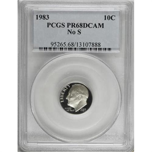 <B>1983 10C No S PR68 Deep Cameo PCGS.</B></I> Brilliant throughout, the devices are heavily frosted and present a stark cameo contrast against the unfathomable depth of reflectivity in the fields. Made in error with no S-mintmark punched into the die.<BR><BR><b>Shipping:</b> Coins & Currency (<a target="_blank" href="http://www.heritageauctions.com/common/shipping.php">view shipping information</a>)