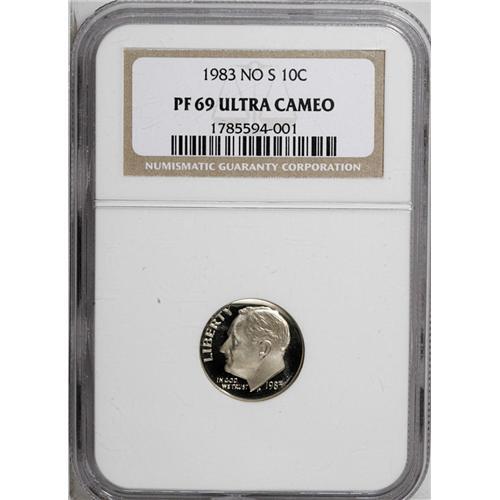 <B>1983<10C> No S PR69 Deep Cameo NGC.</B></I> A virtually perfect black-and-white specimen. Its most obvious "flaw," the missing mintmark, makes this coin an essential for the modern proof enthusiast. Census: 35 in 69, 0 finer (6/06).