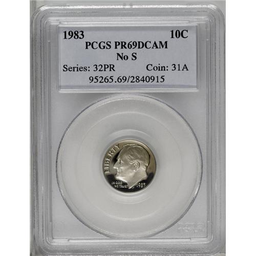 <B>1983<10C> No S PR69 Deep Cameo PCGS.</B></I> The frosted devices have magnificent white-on-black contrast with the deeply reflective fields. A well struck and seemingly pristine example of this rare mint error. Population: 58 in 69 Deep Cameo, 0 finer (3/06).
