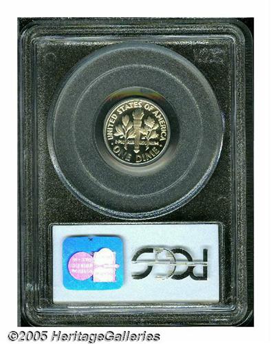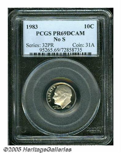 <B>1983<10C> No S PR69 Deep Cameo PCGS.</B></I> This flashy cameo displays white frosty devices over mirrored fields. Sharply defined, with virtually perfect surfaces. Perhaps a few hundred 1983 dimes were struck as proofs from a die that was lacking the S-mintmark. Beginning in 1968, all regular-issue proof coins were struck at the San Francisco Mint, and all were supposed to have a mintmark. A few issues of the three smallest denominations were produced without this mintmark, and these are all rare and highly collectible. Population: 55 in 69 Deep Cameo, 0 finer (6/05).