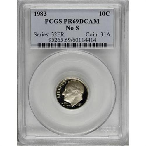 <B>1983 10C No S PR69 Deep Cameo PCGS.</B></I> Perhaps a few hundred 1983 dimes were struck as proofs from a die that was lacking the S-mintmark. Beginning in 1968, all regular-issue proof coins were struck at the San Francisco Mint, and all were supposed to have a mintmark. A few issues of the three smallest denominations were produced without this mintmark. These are all rare and highly collectible. Essentially perfect with blemish-free surfaces. Both obverse and reverse have faint champagne toning over black and white contrast.<BR><BR><b>Shipping:</b> Coins & Currency (<a target="_blank" href="http://www.heritageauctions.com/common/shipping.php">view shipping information</a>)