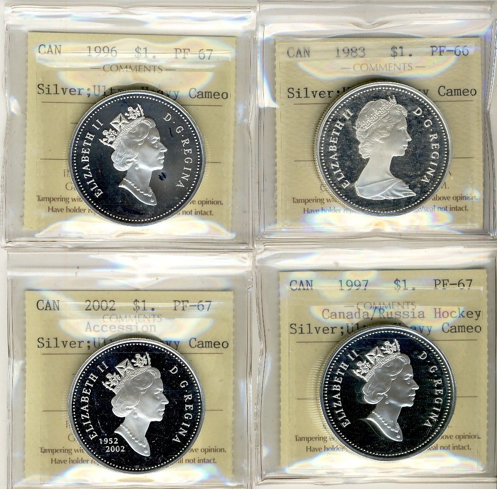1983, 1996, 1997 and 2002 1 Dollars, ICCS PF67; Lot of four silver coins, Ultra Heavy Cameo.