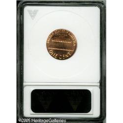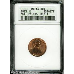 <B>1983 1C Doubled Die Reverse MS66 Red ANACS.</B></I> FS-36. Die #1. The reverse is widely die doubled. Essentially perfect from a technical perspective, this splendid Gem has pink-red color and intense luster. A few tiny air bubbles (as made) and minor softness of strike on STA in STATES prevent an even higher grade. Lot:5596