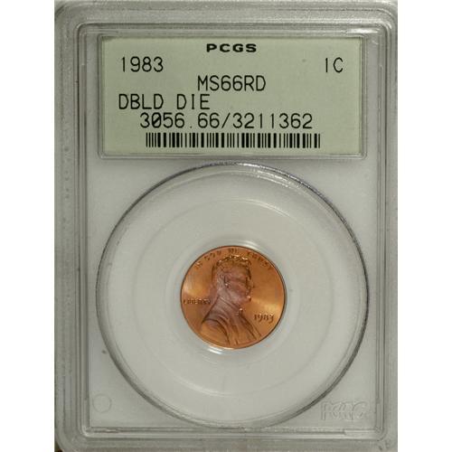 <B>1983 1C Doubled Die Reverse MS66 Red PCGS.</B></I> FS-036. Vivid peach and rose colors endow this highly lustrous and exceptionally preserved Premium Gem. A few trapped air bubbles beneath the copper plate are always encountered on this decidedly die doubled variety, certified in a green-label holder. Another diagnostic is the strong, near-vertical die polishing lines visible behind Lincoln's head. PCGS has certified only 24 pieces finer (4/07).<BR><BR><b>Shipping:</b> Coins & Currency (<a target="_blank" href="http://www.heritageauctions.com/common/shipping.php">view shipping information</a>)