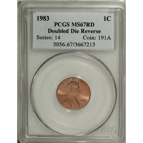 <B>1983 1C Doubled Die Reverse MS67 Red PCGS.</B></I> FS-036. The doubling on the reverse is quite pronounced on all of the lettering. The coloration is bright, original orange-red. Both sides show extensive, nongrade-affecting "pebbling" from the Mint-made tiny trapped gas bubbles present beneath the copper-plating, as always seen on this issue. One of only 24 pieces so graded in MS67 Red, with none finer (4/07).<BR><BR><b>Shipping:</b> Coins & Currency (<a target="_blank" href="http://www.heritageauctions.com/common/shipping.php">view shipping information</a>)