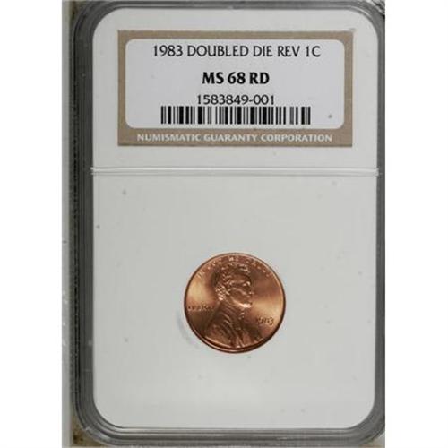 <B>1983 1C Doubled Die Reverse MS68 Red NGC.</B></I> FS-036. An impressive Guide Book variety with a wide spread on the reverse legends and on the horizontal lines of the Memorial. Die polish lines on each side of the portrait suggest that mint personnel concentrated on the appearance of the wrong die. The brick-red surfaces are void of contact or carbon. STATES OF is slightly incomplete, and a few tiny bubbles reside beneath the copper plate. Census: 9 in 68 Red, 0 finer (11/07).<BR><BR><B>Coin Engraver:</B> Victor D. Brenner<BR><BR><b>Shipping:</b> Coins & Currency (<a target="_blank" href="http://www.heritageauctions.com/common/shipping.php">view shipping information</a>)