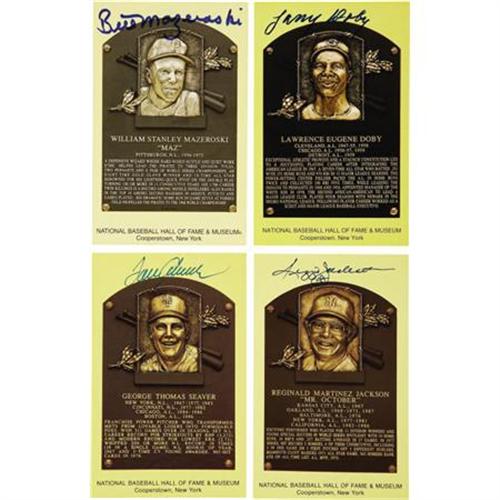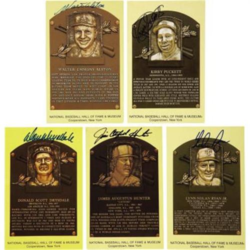 <B>1983-2006 Inductees Signed Gold Hall of Fame Plaques Lot of 60.</B></I> Willie Mays is the only legend missing from this remarkably comprehensive collection of plaques bearing signatures from every enshrinee alive to sign. Matching the theme of excellence in baseball abilities is the quality of the postcards themselves, which appear in NRMT condition with 9/10 or better ink or sharpie autographs unless otherwise noted. The roster: Alston, Kell, Brooks Robinson, Marichal, Aparicio, Drysdale, Killebrew, Ferrell, Reese, Slaughter, Wilhelm, Brock, McCovey, Doerr, Billy Williams, Hunter, Dandridge (8/10), Stargell (8/10), Bench, Barlick, Yastrzemski, Schoendienst, Palmer, Morgan, Jenkins, Carew, Perry, Newhouser, Fingers, Seaver, Reggie Jackson, Rizzuto, Carlton, Schmidt, Ashburn, Weaver, Bunning, Niekro, Lasorda, MacPhail (7/10), Doby, Sutton, Cepeda, Brett, Ryan, Yount, Fisk, Anderson (8/10), Perez, Puckett, Mazeroski, Winfield, Ozzie Smith, Murray, Carter, Molitor, Eckersley (7/10), Sandberg, Boggs, Sutter. <I>LOA from PSA/DNA. LOA from James Spence Authentication.</B></I><BR><BR><b>Shipping:</b> Flat Material, Small (<a target="_blank" href="http://www.heritageauctions.com/common/shipping.php">view shipping information</a>)