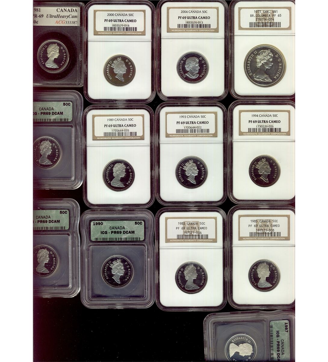 1983 50¢, 1985, 1989, 1993, 1994, 2000, 2004 All NGC PL69, 1981 ACG PR69 & 1987, 1988, 1989, 1990 IC