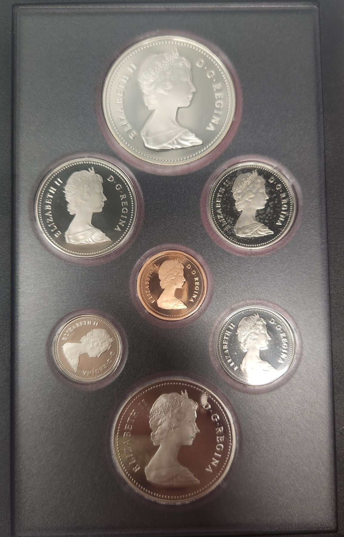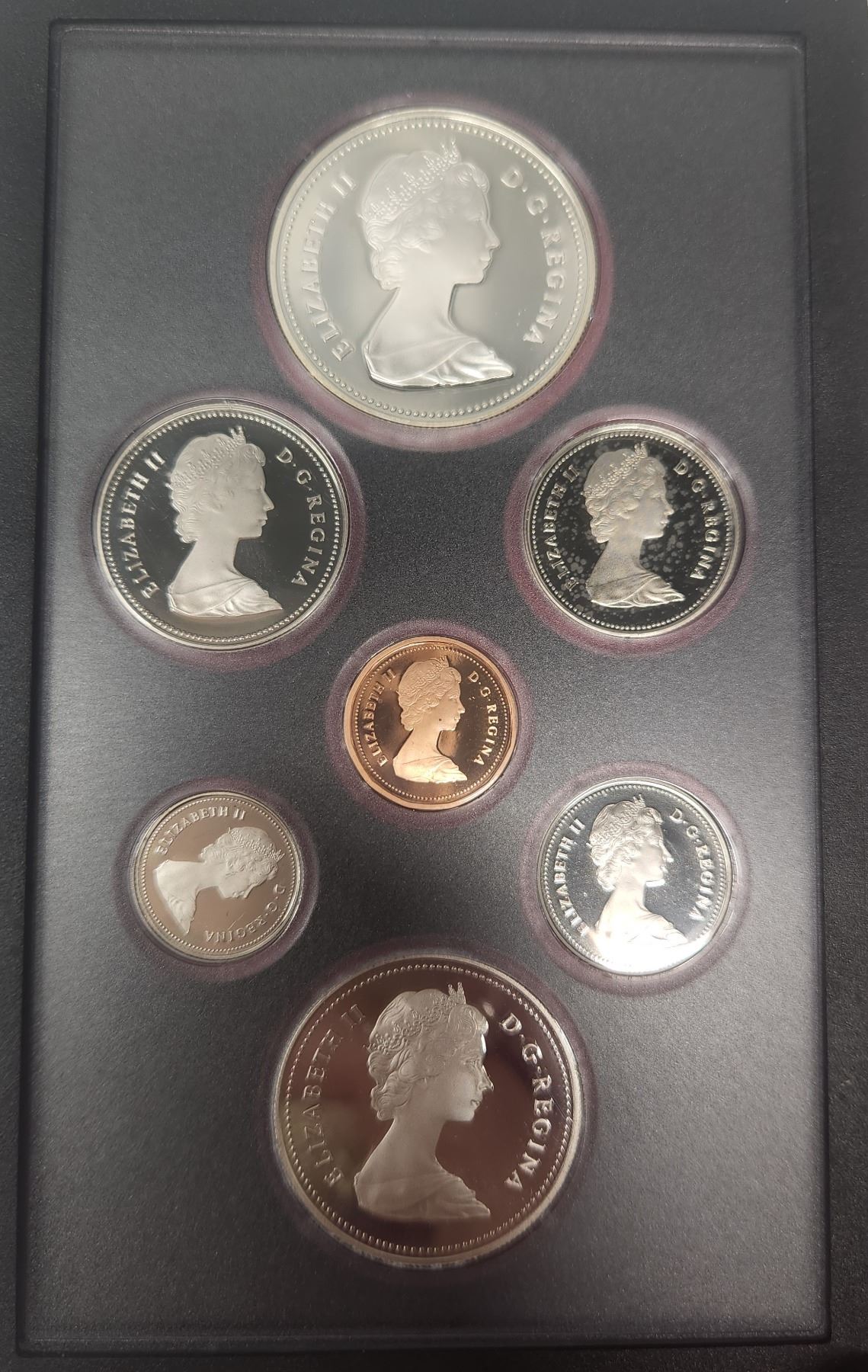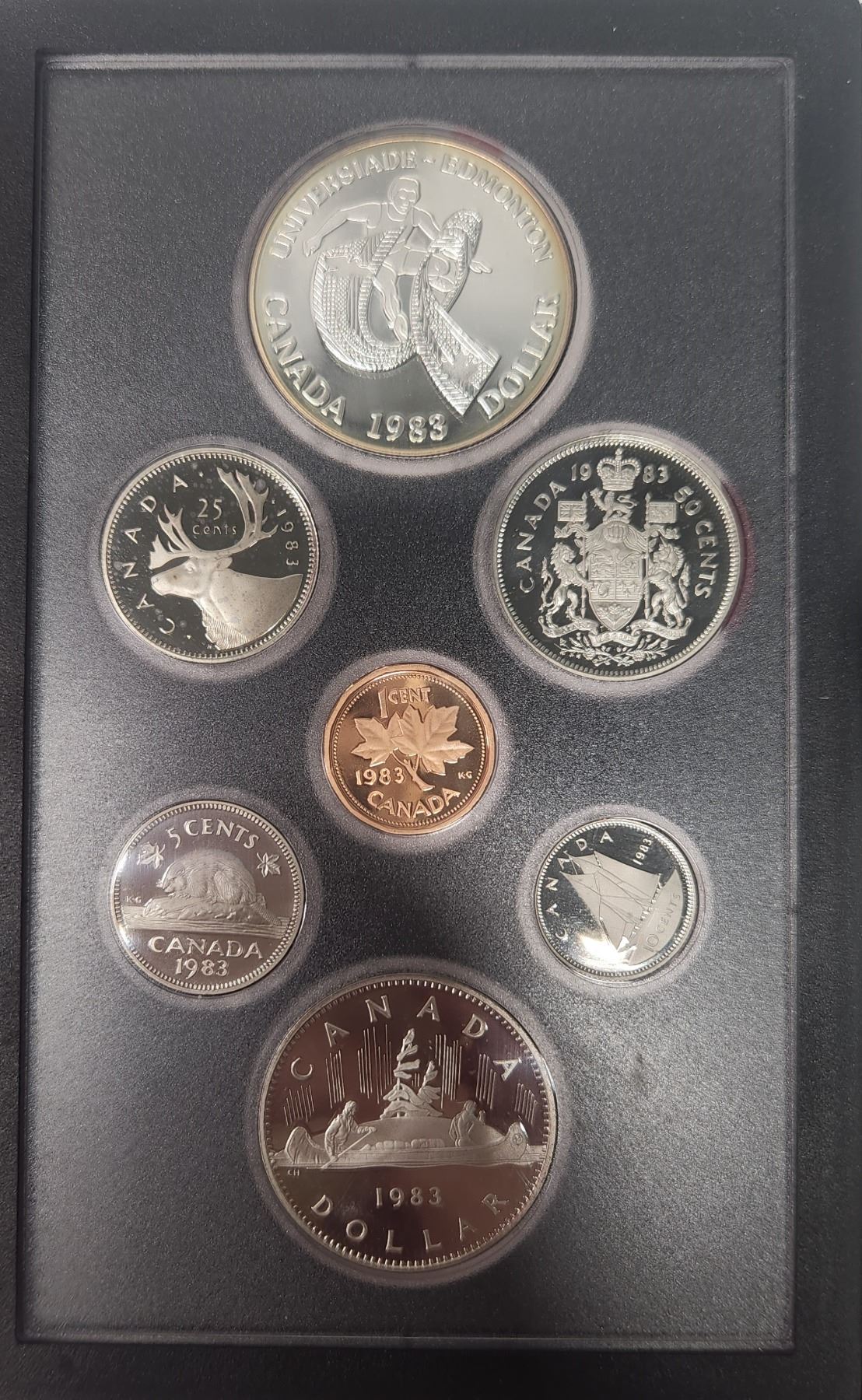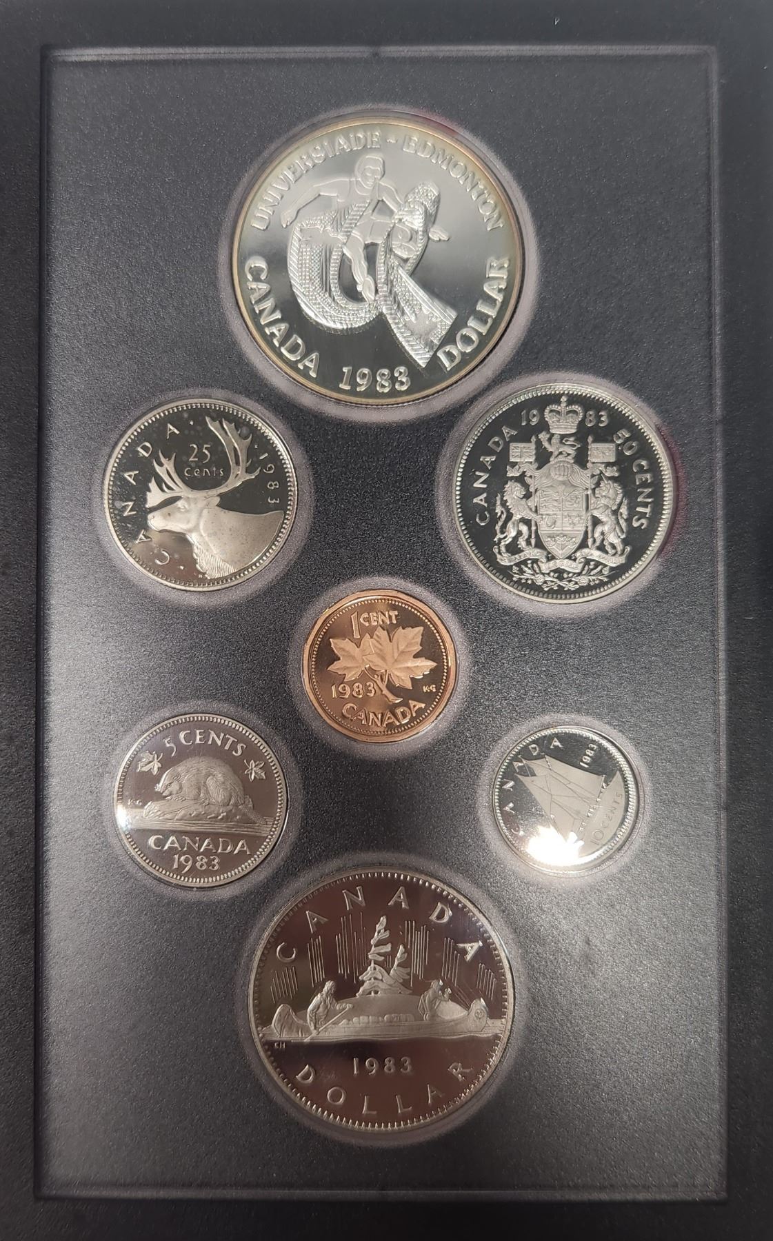 1983 7-coin Double Dollar Silver Proof Set. Includes Silver Dollar that commemorates the World University Games in Edmonton. In case of issue.