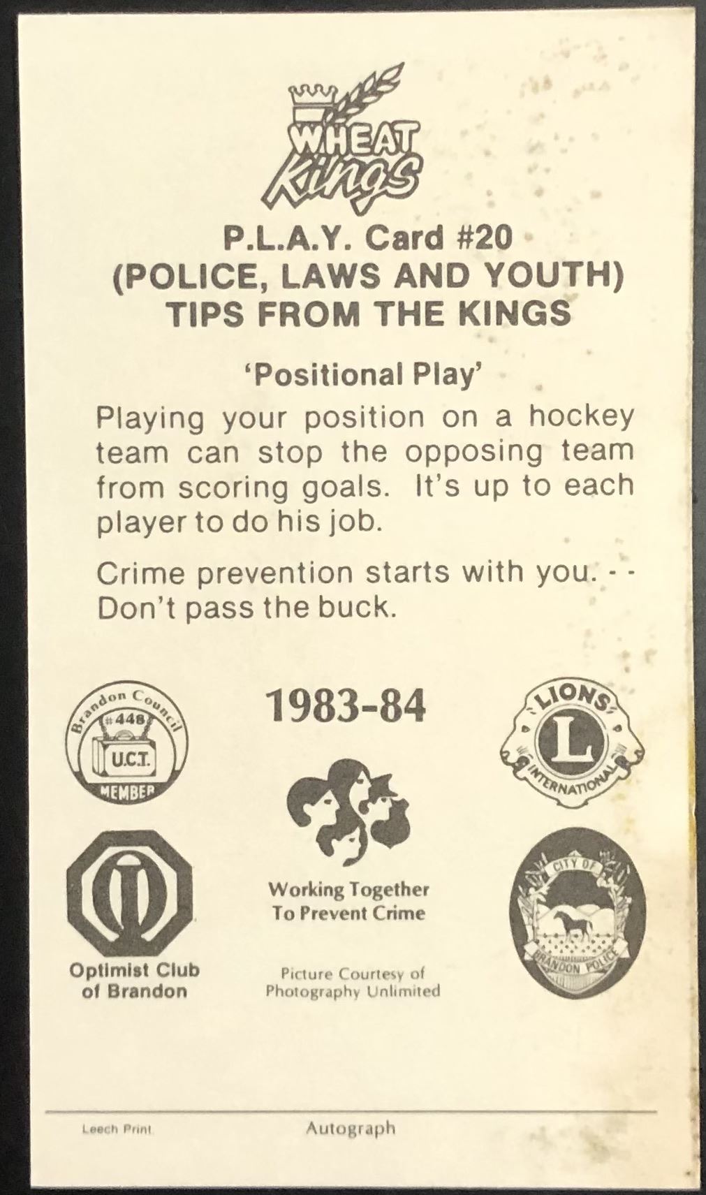 Card #20 Issued by Brandon Police PLAY program, CHL, WHL, hockey, rookie, vintage, regional