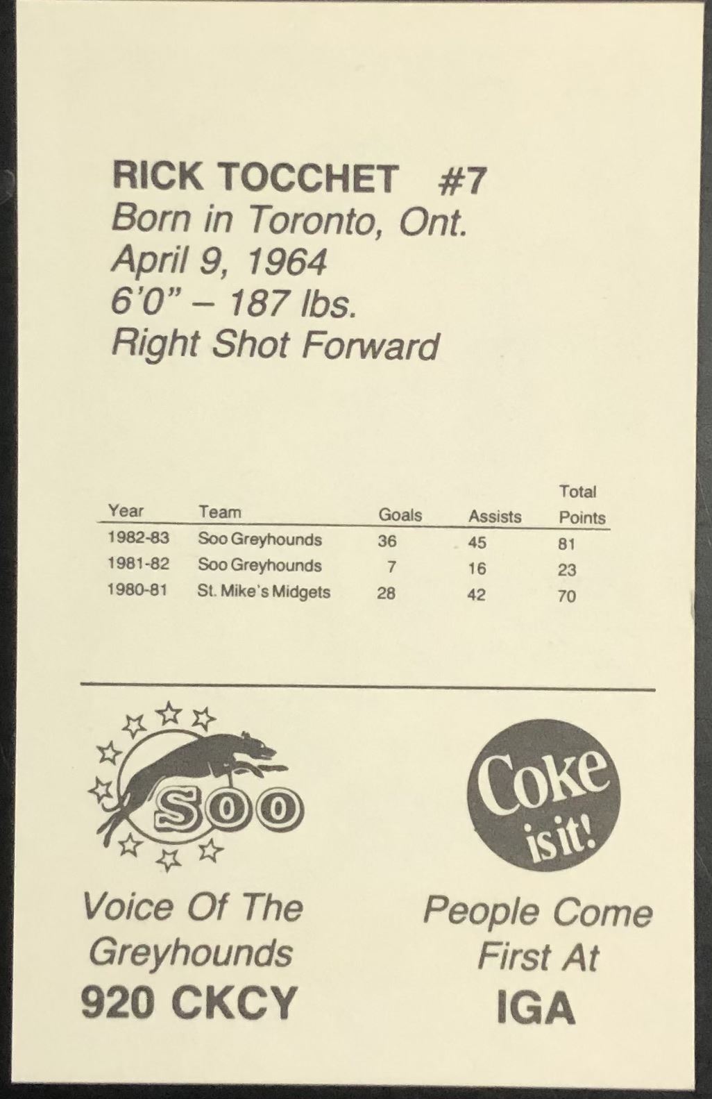 Card #7 Issued by Sault Ste. Marie PLAY program, CHL, OHL, hockey, rookie, vintage, regional