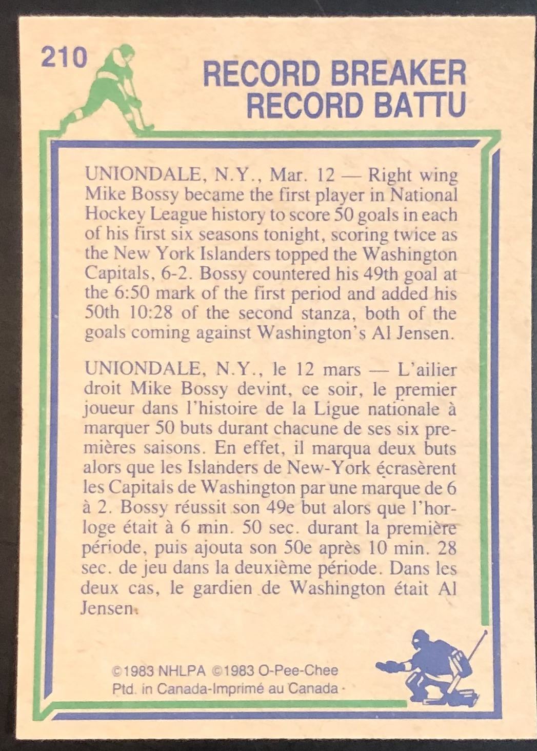 Card #210 OPC, vintage, NHL, hockey, hall of fame