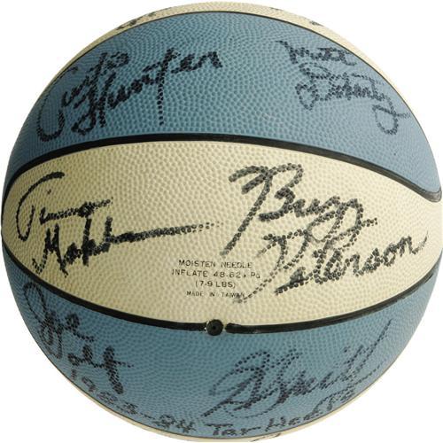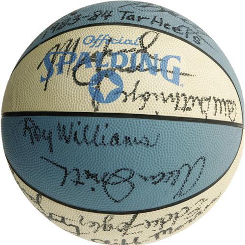 <B>1983-84 University of North Carolina Tarheels Team Signed Basketball with Jordan.</B></I> Michael Jordan and Sam Perkins each earned All-America honors the year eighteen members of this powerhouse NCAA hardcourt program put sharpie to the white and Tarheel blue of this Official Spalding sphere. Roy Williams and Sam Perkins are also present, in the same 9/10 black sharpie that characterizes all the other autographs as well. While there is no shortage of material from Jordan's glory days in Chicago, pieces relating to his collegiate career are quite rare and carry tremendous appeal among serious collectors of his artifacts. <I>LOA from PSA/DNA.</B></I>