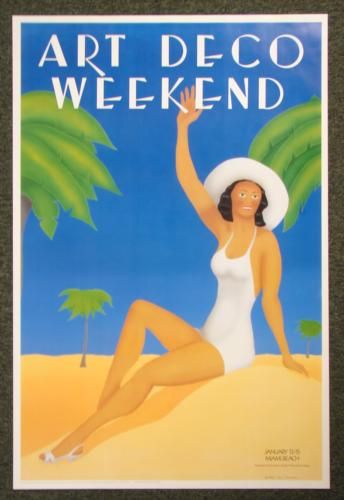 This is a cool poster entitled "Art Deco Weekend - January 13-15 Miami Beach" done in 1983 by Woody Vondracek. It is signed on the poster plate by the artist (not hand signed). This poster combines the natural beauty of Miami Beach with an Art Deco Bathi