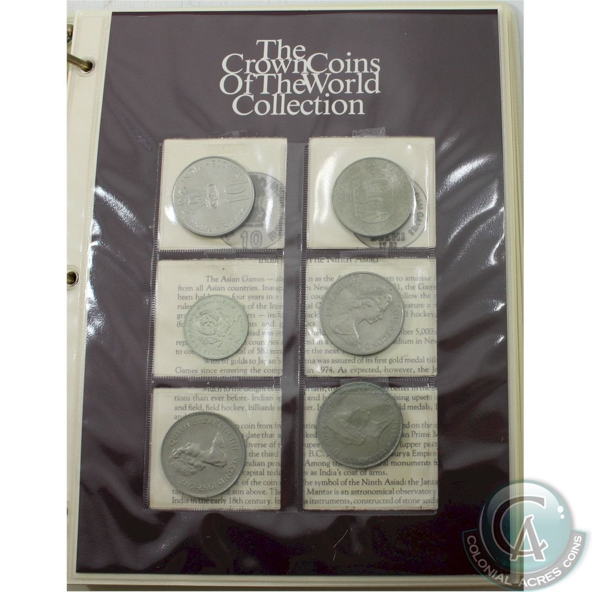 1983 Calhoun's Collectors society Inc. "The Historic Crown Coins of the World Collection" with deluxe folder and slipcase (slipcase is tattered). This collection contains 48 different coins from around the world with accompanying information card. Some highlights you will receive include: 1982 Isle of Man World Cup Soccer, 1967 French Central Pacific Franc New Caledonia, 1972 Gibraltar Silver Wedding Anniversary Crown, 1974 Western Samoa Banana Tree Crown, 1981 Falkland Islands Royal Wedding Crown, 1982 Fiji Native Canoe Crown, 1982 Mexico 60 Peso Crown, 1982 Tonga Christmas Crown, 1974 Sierra Leonne Anniversary Crown, 1983 Falkland Islands 150 years of British Rule Crown, 1982 New Zealand HMS Endeavor Crown, 1981 Western Samoa International Year of Disabled Persons Crown, 1975 India International Women's Year Crown, 1970 Australia Silver Jubilee Crown, 1981 Bulgaria Thirteenth Centennial Crown, 1973 British Crown Colony of st. Helena, 1977 Bailiwick of Jersey Silver Jubilee Crown, 1981 New Zealand Royal Visit one Dollar, 1982 India Asian Games Crown, 1981 St. Helena Royal Wedding Crown, 1981 Republic of Cyprus 500-mil coin, 1982 Ethiopia World Cup Crown, 1981 Tristan da Cunha Royal Wedding Crown, 1982 Singapore Benjamin Sheares Bridge Crown, 1980 British Crown Colony of St. Helena Queen Mother Crown, 1978 Bailiwick of Guernsey Royal Visit 25-penny Crown and much more! 48pcs