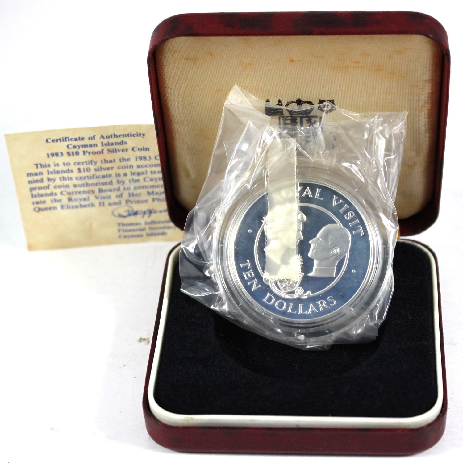 1983 Cayman Island $10 Sterling Silver coin Commemorating the royal visit of Queen Elizabeth and Prince Philip (.6974oz pure). Coin is toned and packaging show signs of aging.
