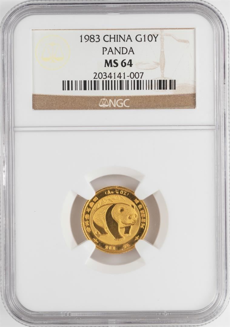 One 1983 China 1/10 oz Gold 10 Yuan Panda Coin NGC MS64. NGC Certified.