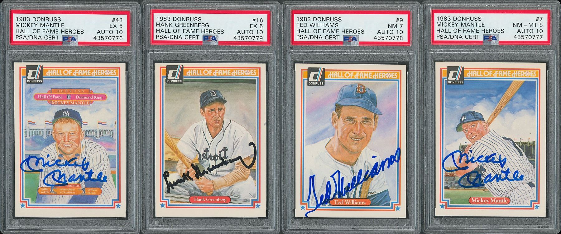 Graded Cards (each card graded has an autograph graded PSA GEM MINT 10). Includes: #7 Mantle (Card, PSA 8), 9 Williams (Card, NM 7), 16 Greenberg (Card, EX 5), and 43 Mantle (Card, EX 5).