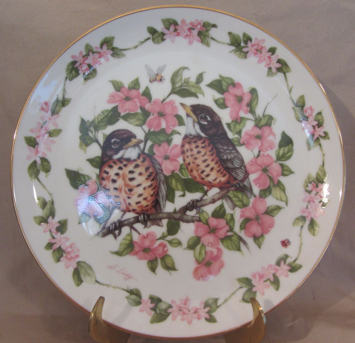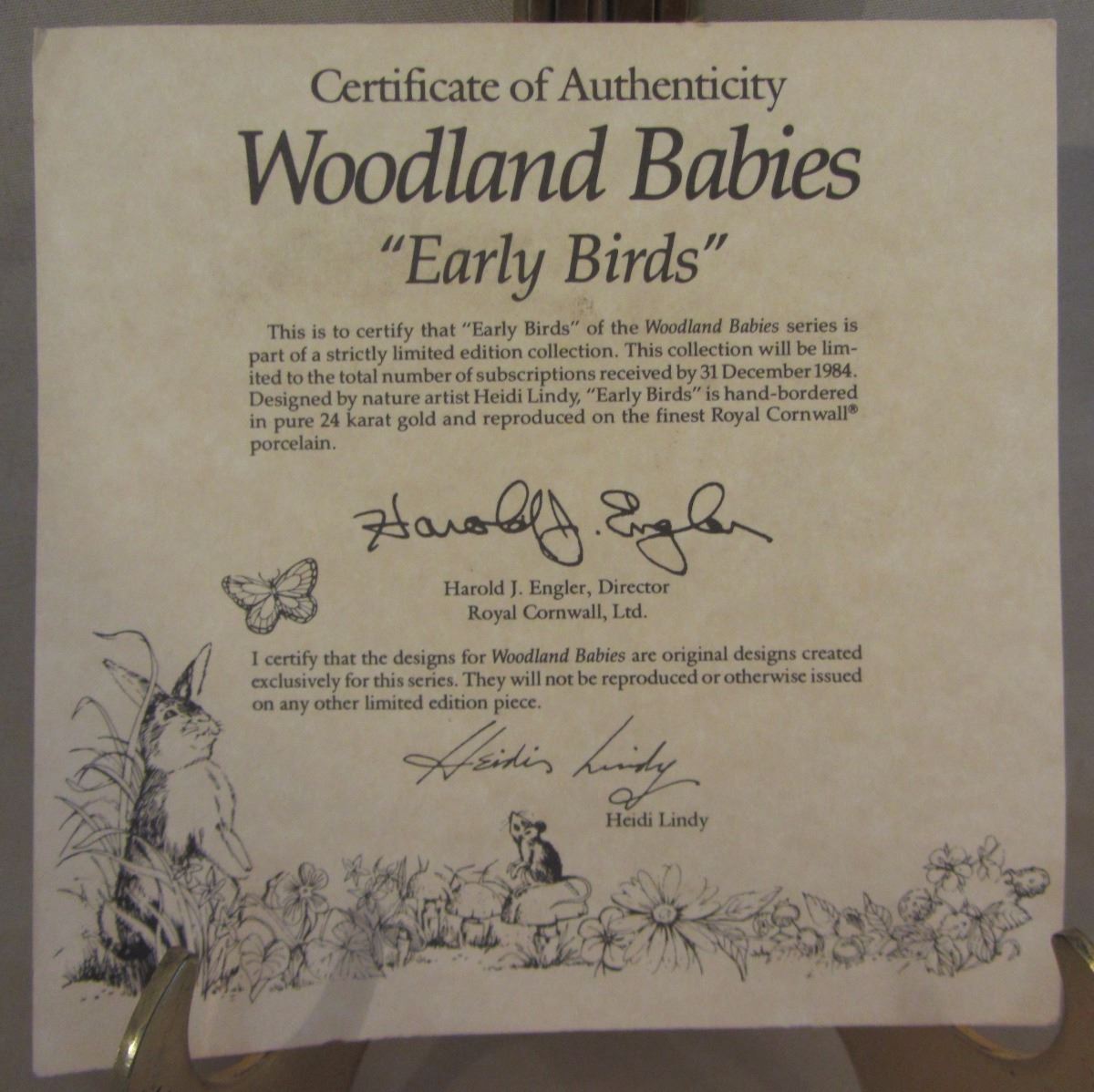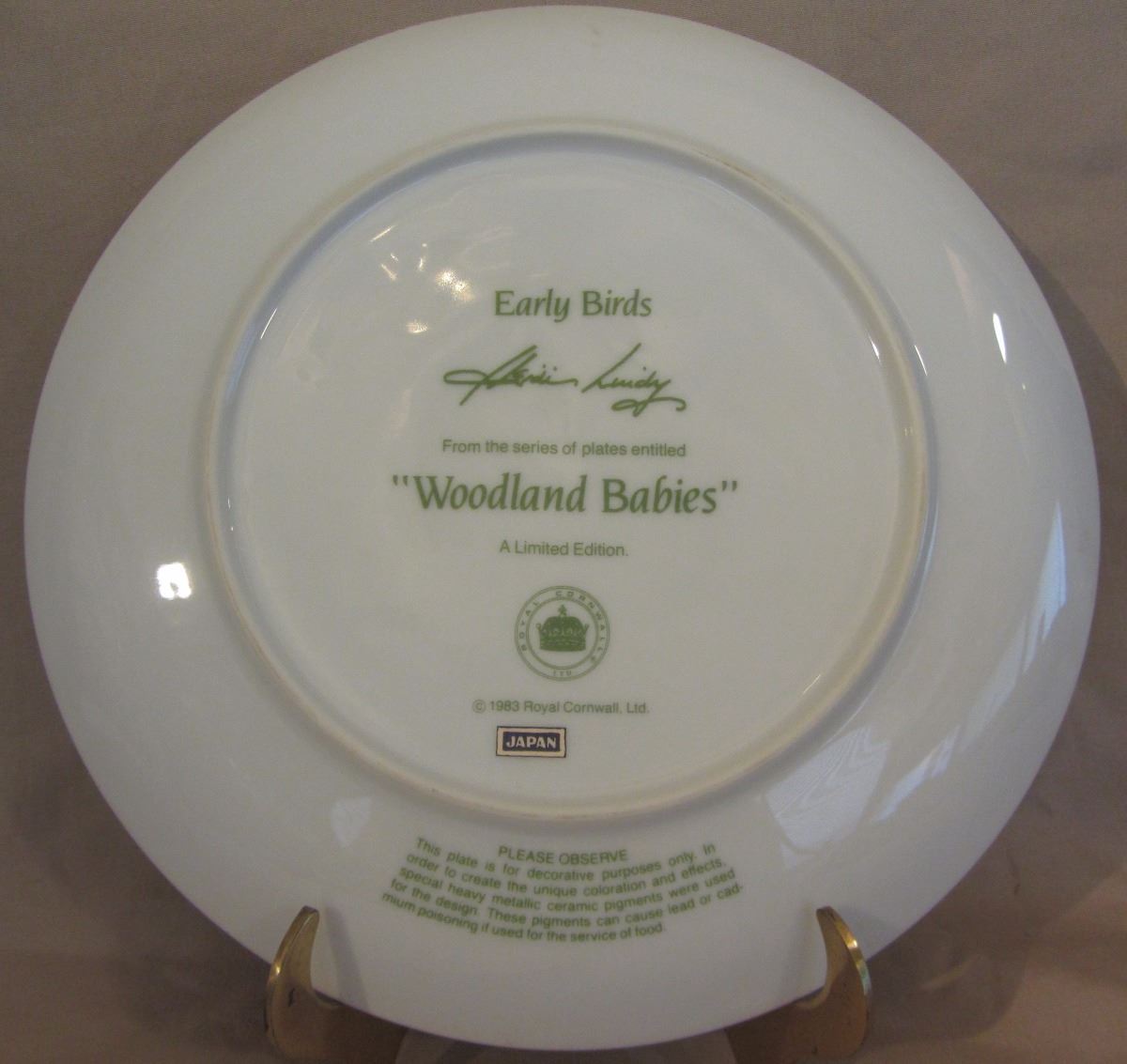 9 1/4" plate, dated 1983 'Early Birds' is one of the plates in the series of plates entitled 'Woodland Babies'. These plates are hand-bordered in 24K gold and are limited edition plates by Royal Cornwall, Ltd and designed by nature artist Heidi Lindy. The plate is in the original box with COA. (Please see images for details)