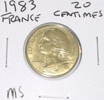 1983 FRANCE 20 CENTIMES *RARE MS HIGH GRADE!! COIN CAME OUT OF SAFE!! ***Coin, Currency & All Items Listed in this auction - Grades, Conditions and Values are not Safe Deposit Coins LLC Responsibilty. Grades, Condition and Values are determined by Consigner(s) & Buyers ONLY