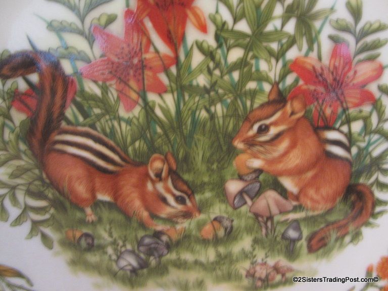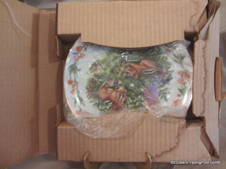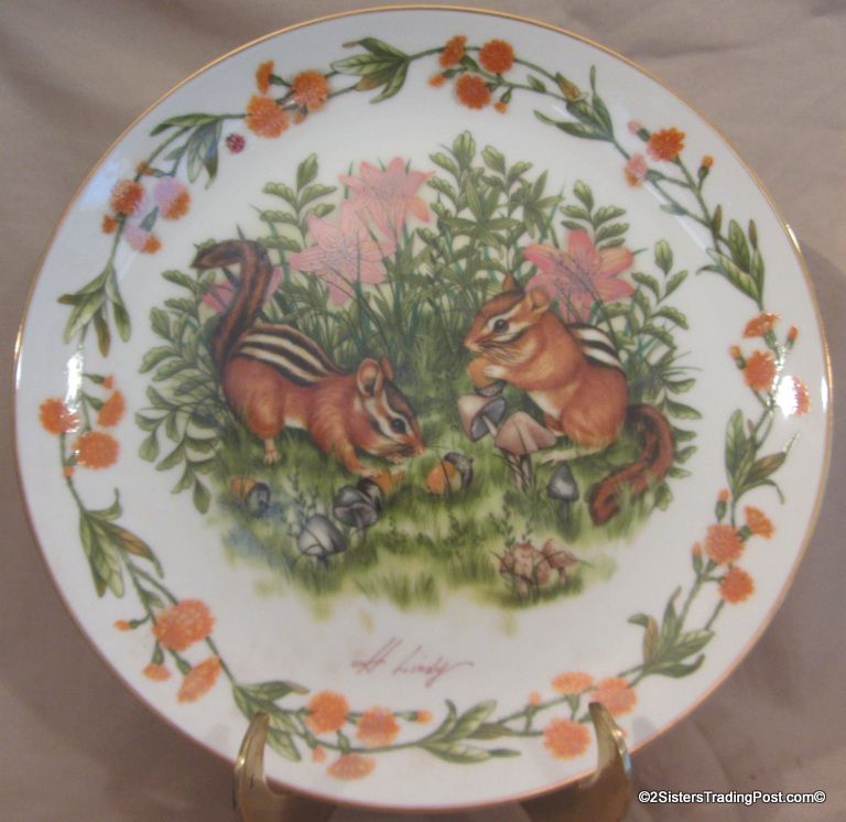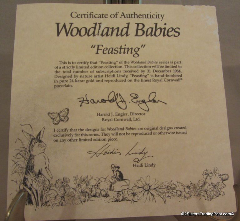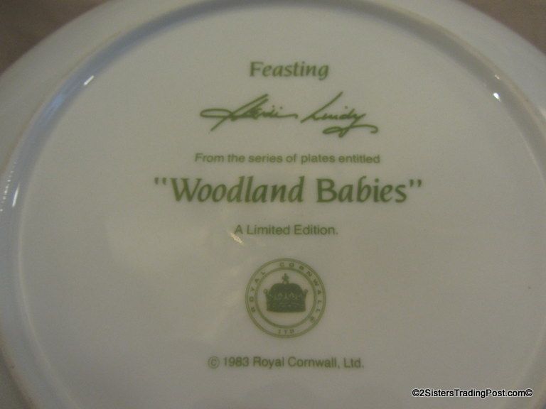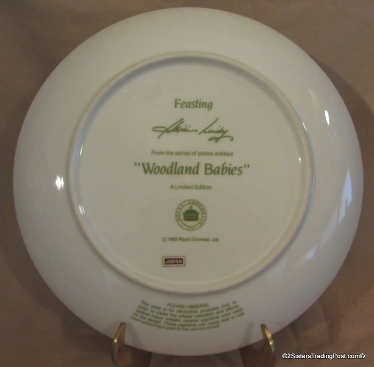 9 1/4" plate, dated 1983 'Feasting' is one of the plates in the series of plates entitled 'Woodland Babies'. These plates are hand-bordered in 24K gold and are limited edition plates by Royal Cornwall, Ltd and designed by nature artist Heidi Lindy. The plate is in the original box with COA. (Please see images for details)