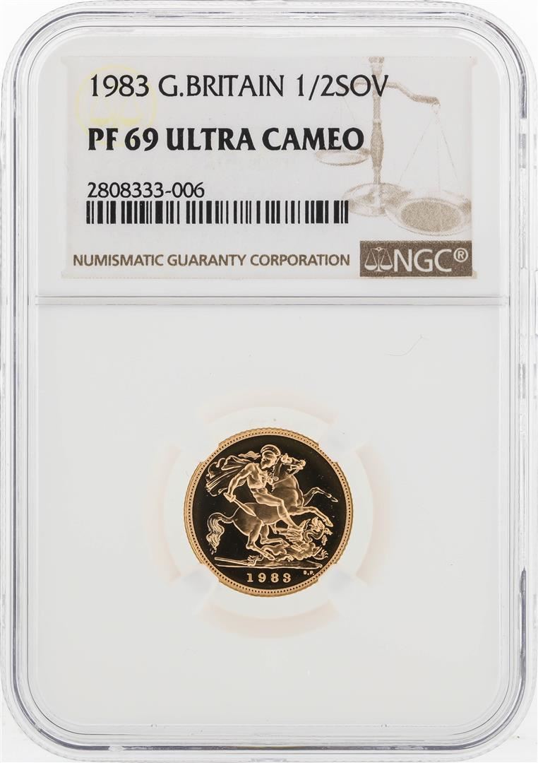 One 1983 Great Britain 1/2 Sovereign Gold Coin NGC PF69 Ultra Cameo. NGC Certified.