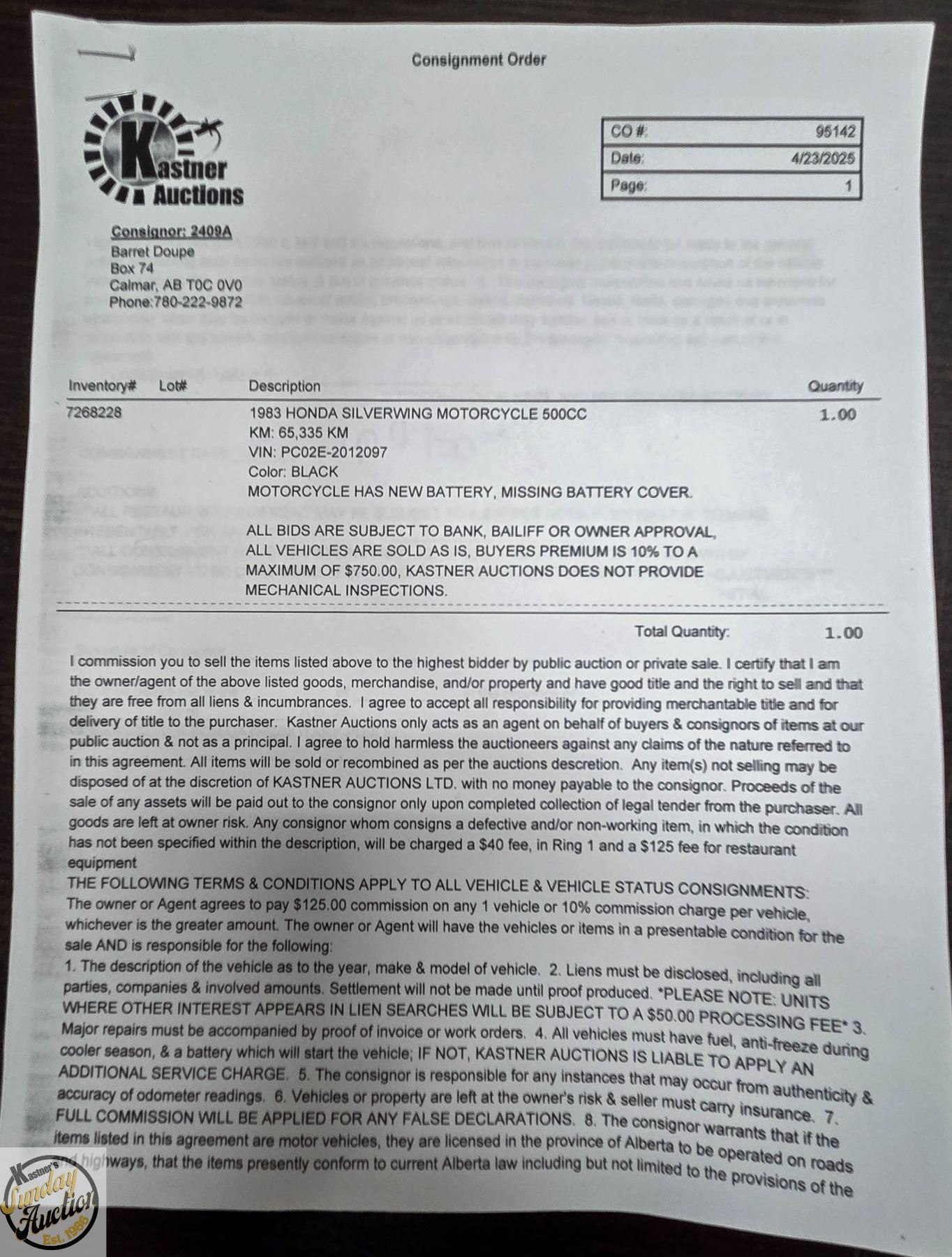 Kastner Auctions Limited assumes no responsibility for any liability once a bid is accepted. It is recommended that purchasers arrange insurance for their purchases in advance.