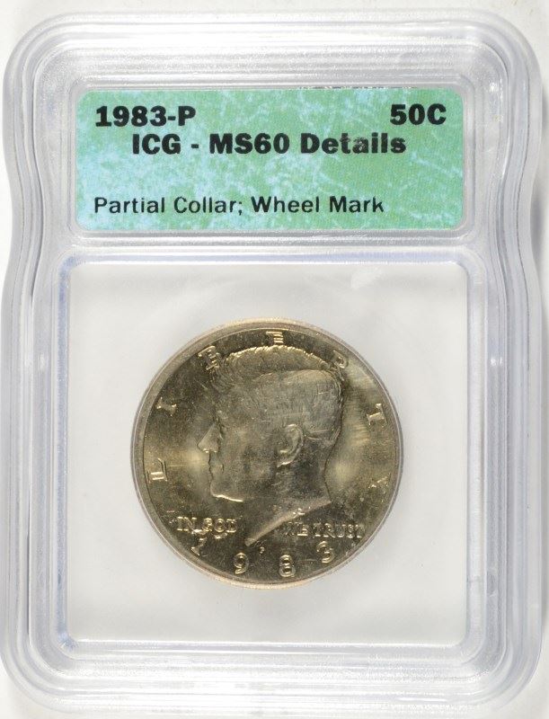 1983 KENNEDY HALF DOLLAR ICG MS-60 DETAILS (MINT ERROR-PARTIAL COLLAR, WHEEL MAR