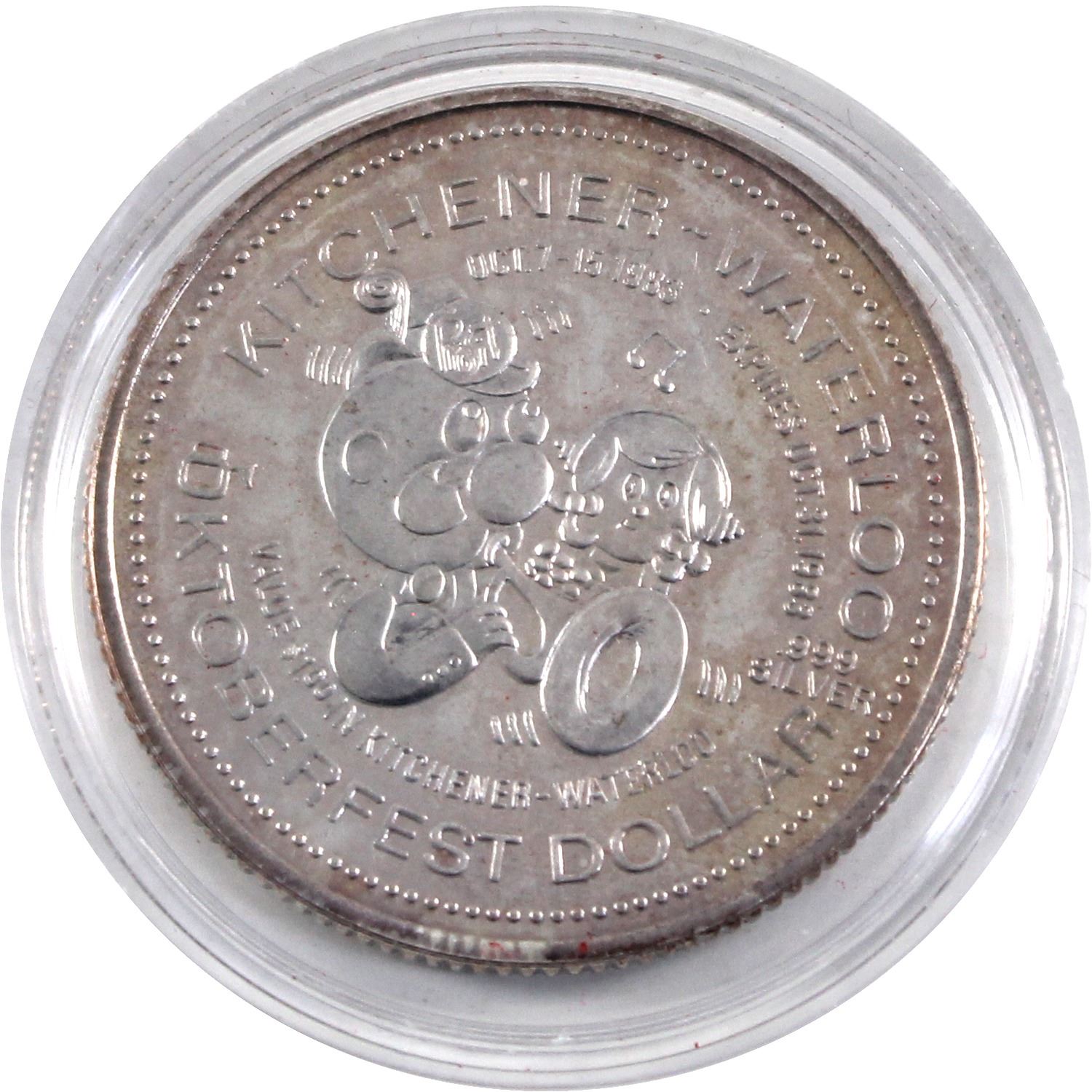 1983 Kitchener-Waterloo .999 Fine Silver Oktoberfest $1.00 Token. Coin is lightly toned (Tax Exempt). according to the 2005 Municipal Trade Tokens book by Serge Peletier. The coins diameter is 33mm and has a weight of 17.67 grams with a mintage of 150.