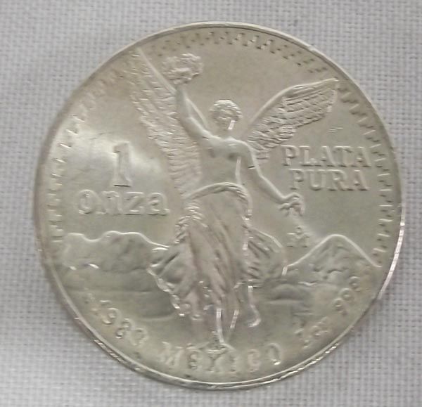 1983 Mexican 1 Onza Coin. Mexican silver coin, .999 pure silver, excellent condition.