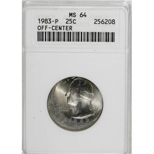 <B>1983-P 25C --Off-Center--MS64 ANACS.</B></I> NGC Census: (19/72). PCGS Population (69/198). Mintage: 673,534,976. Numismedia Wsl. Price for NGC/PCGS coin in MS64: $22. (#5914)<BR><BR><B>Coin Engraver:</B> John Flanagan<BR><BR><b>Shipping:</b> Coins & Currency (<a target="_blank" href="http://www.heritageauctions.com/common/shipping.php">view shipping information</a>)