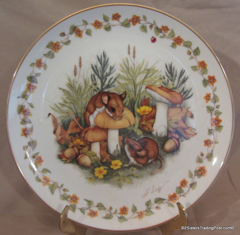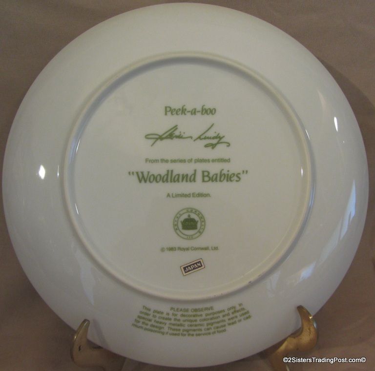 9 1/4" plate, dated 1983 'Peek-a-boo' is one of the plates in the series of plates entitled 'Woodland Babies'. These plates are hand-bordered in 24K gold and are limited edition plates by Royal Cornwall, Ltd and designed by nature artist Heidi Lindy. The plate is in the original box with COA. (Please see images for details)