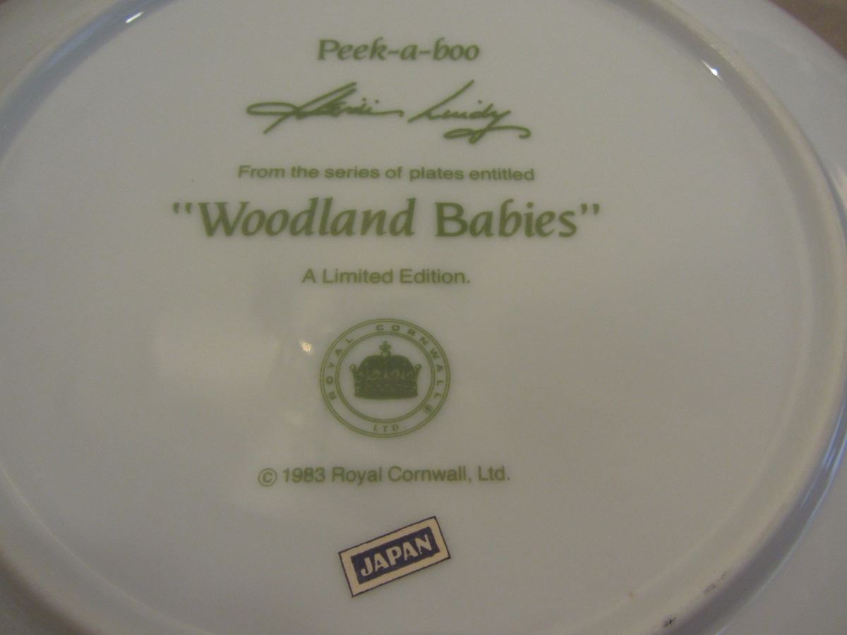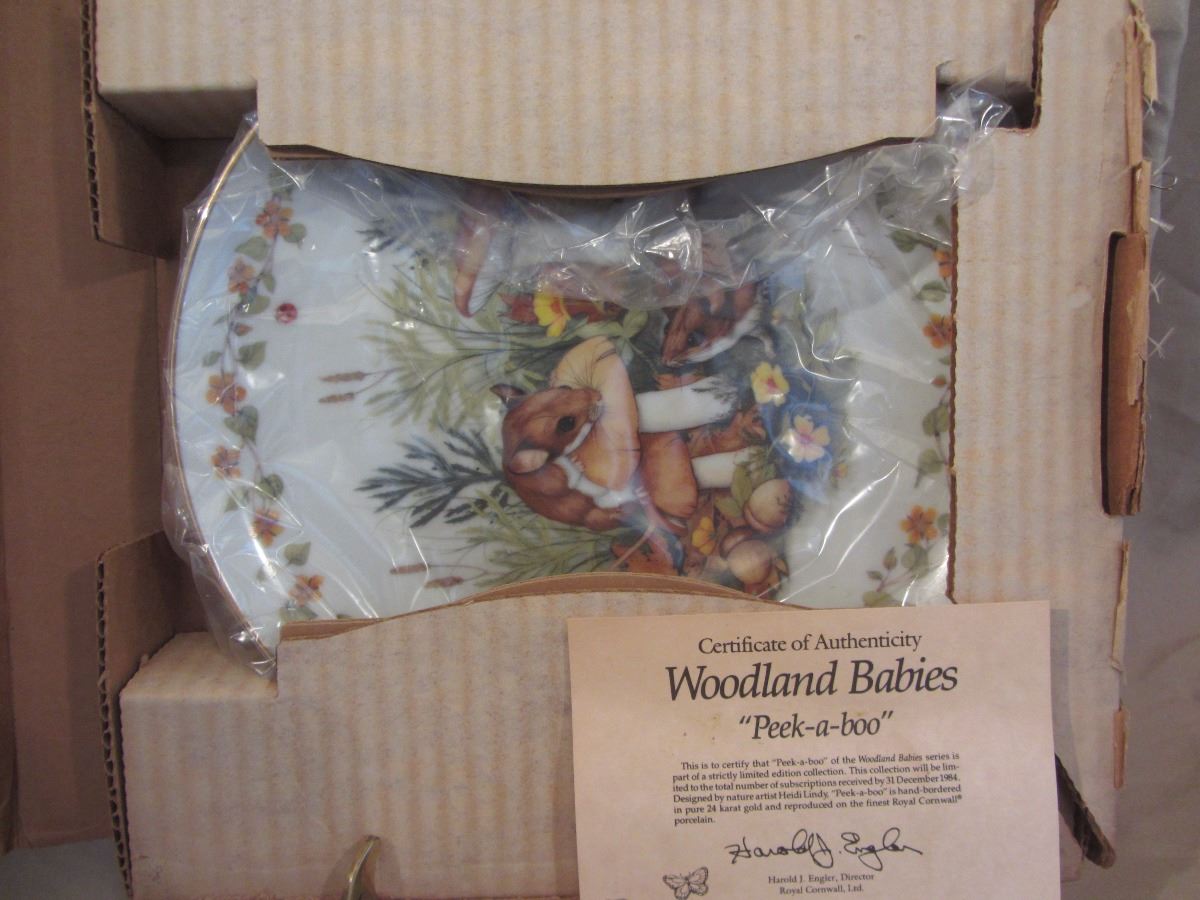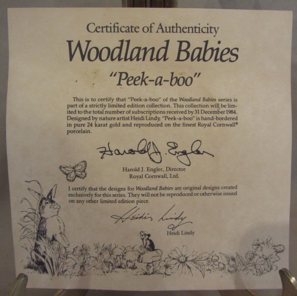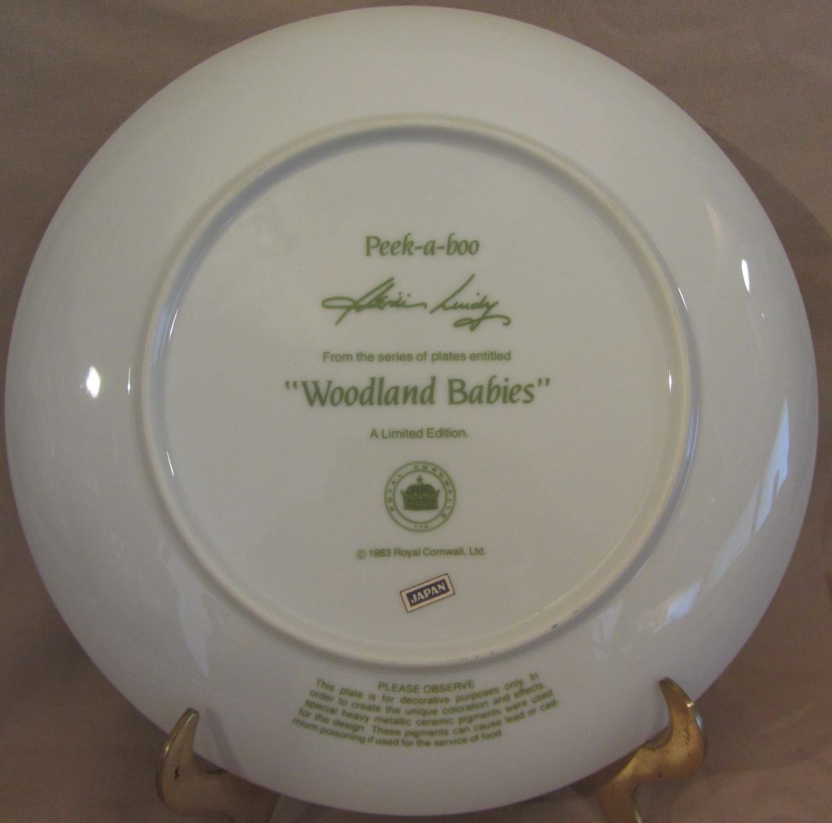 9 1/4" plate, dated 1983 'Peek-a-boo' is one of the plates in the series of plates entitled 'Woodland Babies'. These plates are hand-bordered in 24K gold and are limited edition plates by Royal Cornwall, Ltd and designed by nature artist Heidi Lindy. The plate is in the original box with COA. (Please see images for details)