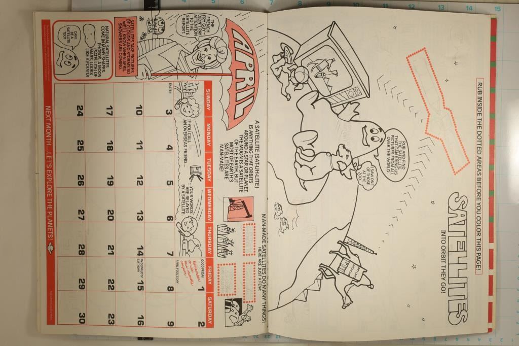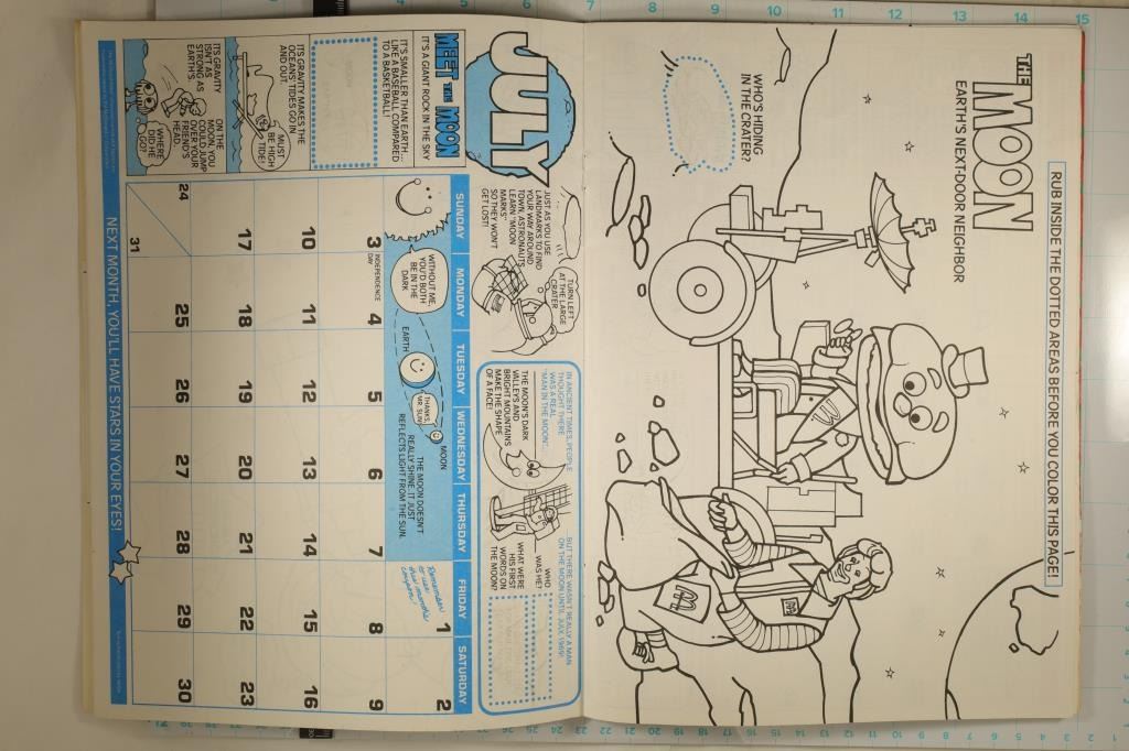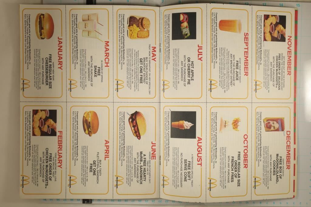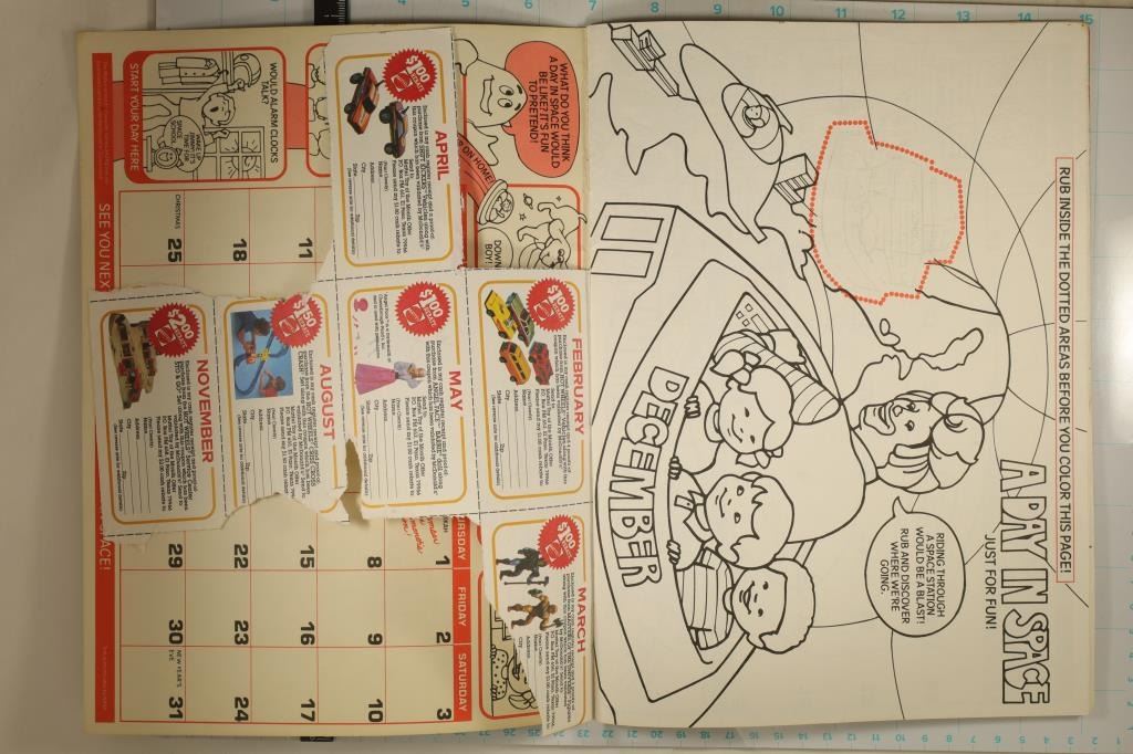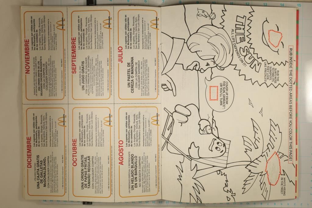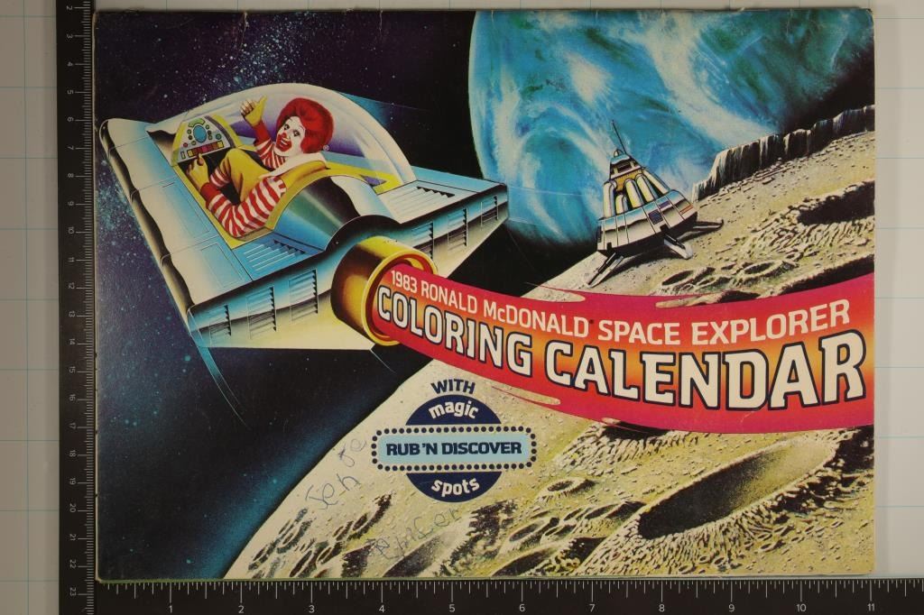 CALANDER WITH MAGIC RUB 'N DISCOVER SPOTS. NEAT PIECE OF OLD SCHOOL MCDONALD'S, SOME COUPONS IN THE BACK HAVE BEEN REMOVED AND THE COVER HAS SOME INK ON IT. OTHERWISE CALANDER IS COMPLETE.