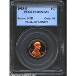 1983-S 1C PR70 Deep Cameo PCGS. One of only twenty-three 1983-S Lincoln Cents graded PR70 Deep Cameo by PCGS, this is one coin which certainly seems to deserve the grade. The proof mirrors are jet-black and seemingly bottomless, contrasting sharply with the fabulous cameo devices. A gorgeous, unimprovable, essentially flawless Superb Gem.From the collection of William Bland. Important notice: We expect to be auctioning lots at the rate of 200-250 per hour. Sometimes eBay Premier live bid software cannot keep up with that pace, so we strongly recommend that you place a realistic proxy bid now as insurance to avoid disappointment. Also please note that all Heritage/CAA lots purchased through eBay Premier carry a 20% Buyer's Premium. Please make sure you read the Terms and Conditions.