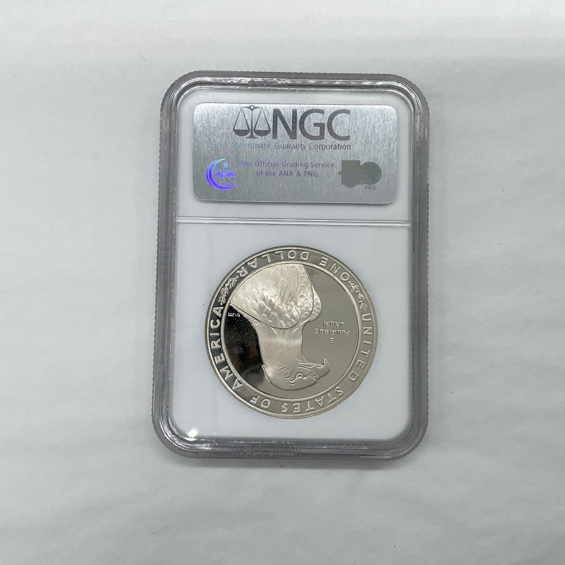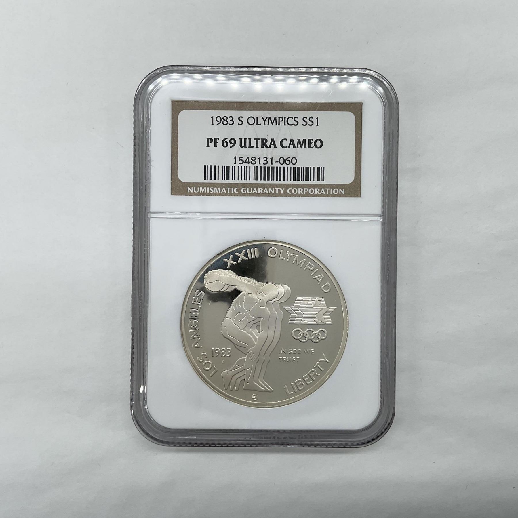 NGC Graded and Slabbed PF69 Ultra Cameo. San Francisco Mint. A coin that celebrates the 1984 Summer Olympics in Los Angeles. The obverse side depicts a Myron's Greek discus thrower with the Stars In Motion logo. The reverse side features an American Bald Eagle. The coin is in a protective case. The case is approximately: 2.25"L x 0.5"W x 3.5"H.