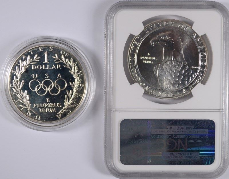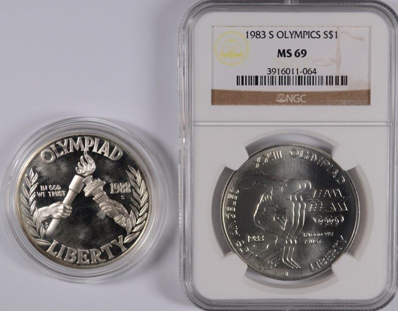 1983-S OLYMPIC SILVER DOLLAR, NGC MS-69 AND 1988 OLYMPIC SILVER DOLLAR COIN/CAP