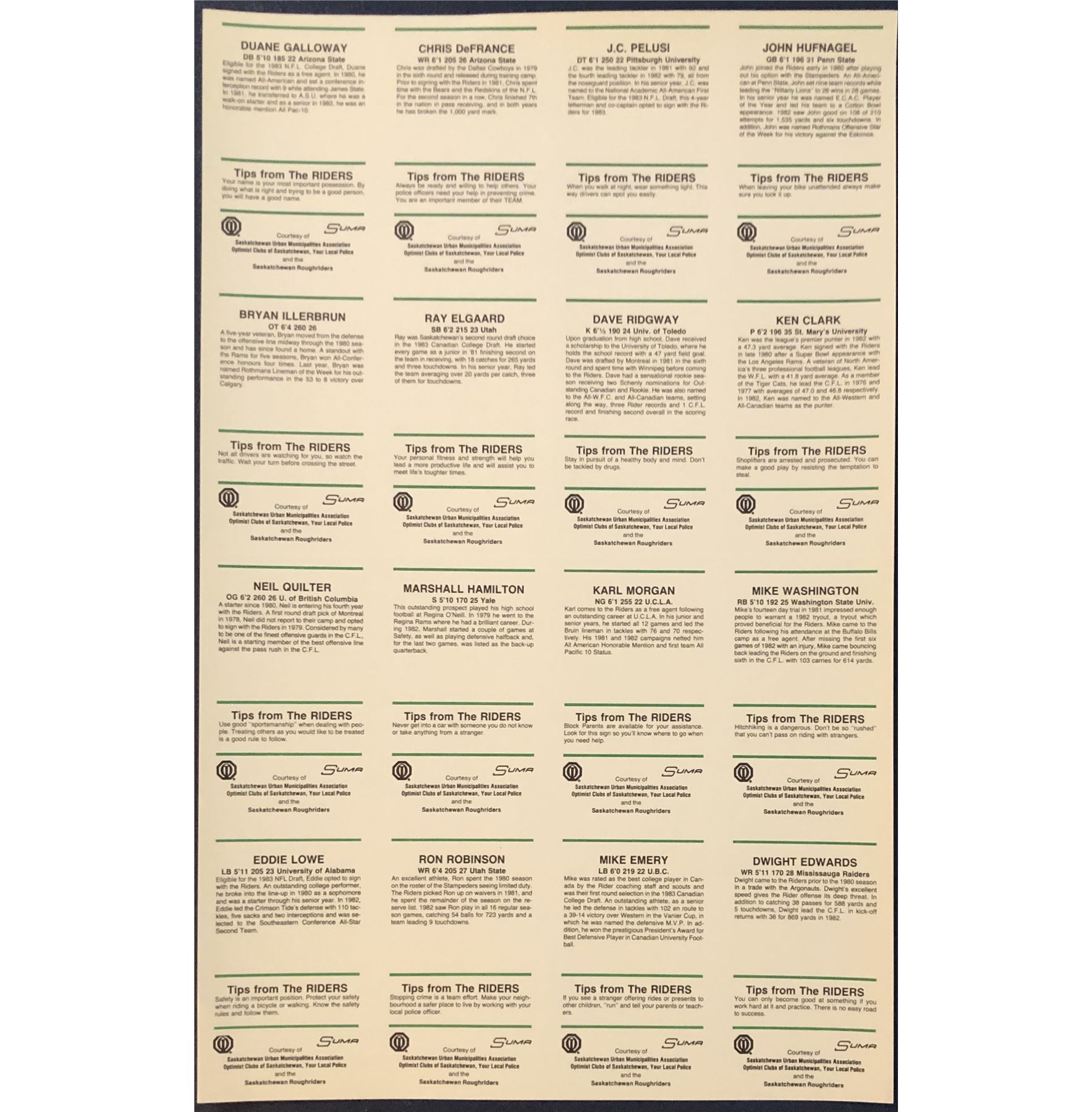 16 card set on uncut sheet CFL, football, vintage, regional