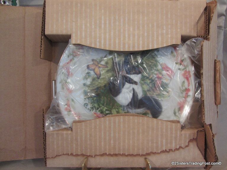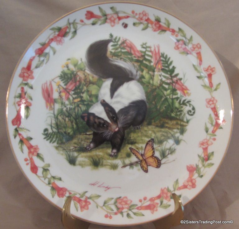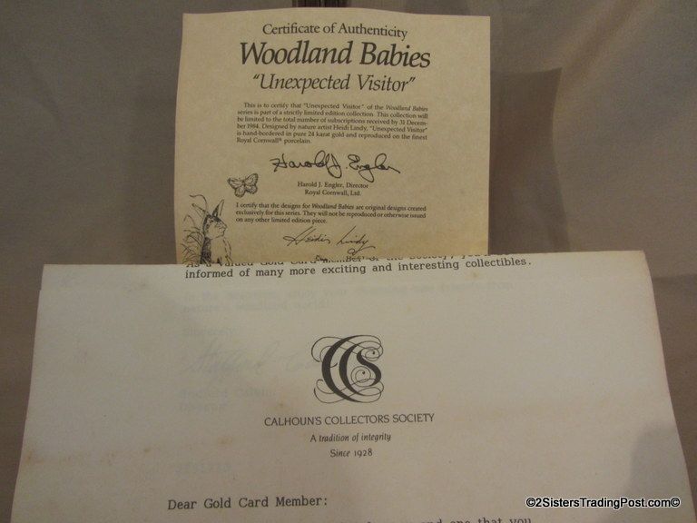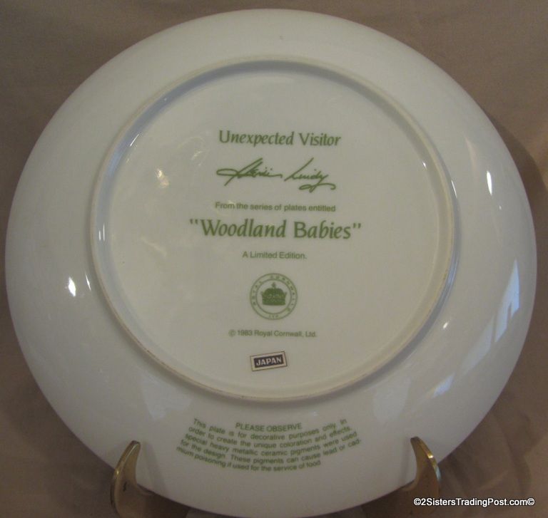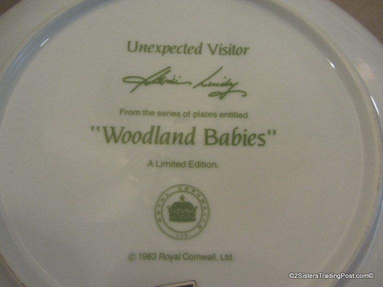 9 1/4" plate, dated 1983 'Unexpected Visitor' is one of the plates in the series of plates entitled 'Woodland Babies'. These plates are hand-bordered in 24K gold and are limited edition plates by Royal Cornwall, Ltd and designed by nature artist Heidi Lindy. The plate is in the original box with COA. (Please see images for details)